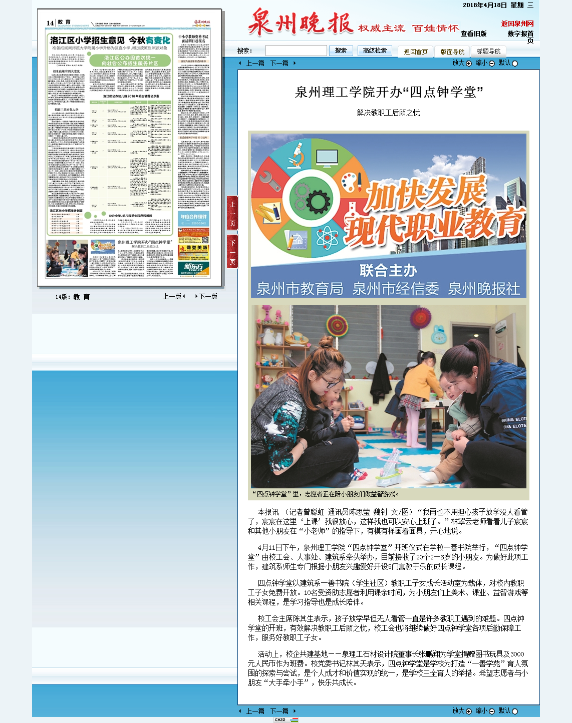 “我再也不用担心孩子放学没人看管了,宸宸在这里‘上课’我很放心,这样我也可以安心上班了。”林翠云老师看着儿子宸宸和其他小朋友在“小老师”的指导下,有模有样画着面具,开心地说。 4月11日下午,泉州理工...