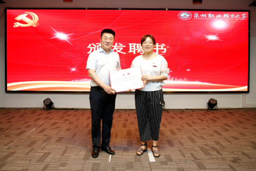 庄文瑞副校长宣读《关于成立泉州职业技术大学马克思主义学院的通知》文件, 经学校党委研究,决定在思政教研部基础上成立马克思主义学院,聘请钟君为马克思主义学院名誉院长,特聘刘小新为马克思主义学院专家组组长,特聘王福民为马克思主义学院专家,聘任林其天为马克思主义学院院长、林文艺和陈静为马克思主义学院副院长。