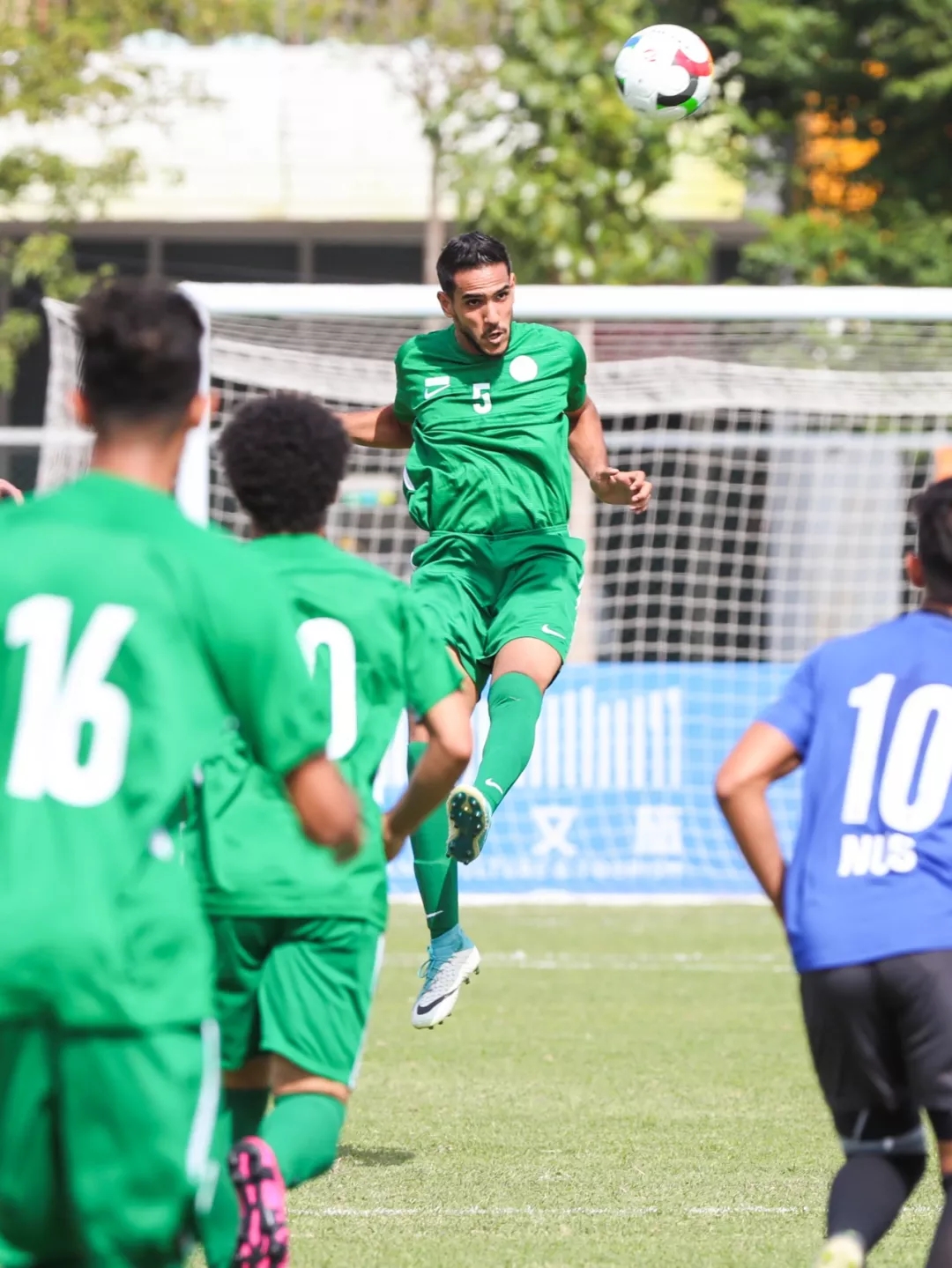 本场比赛新加坡国立大学队身着蓝色球衣,费萨尔国王大学队身着绿色球衣。