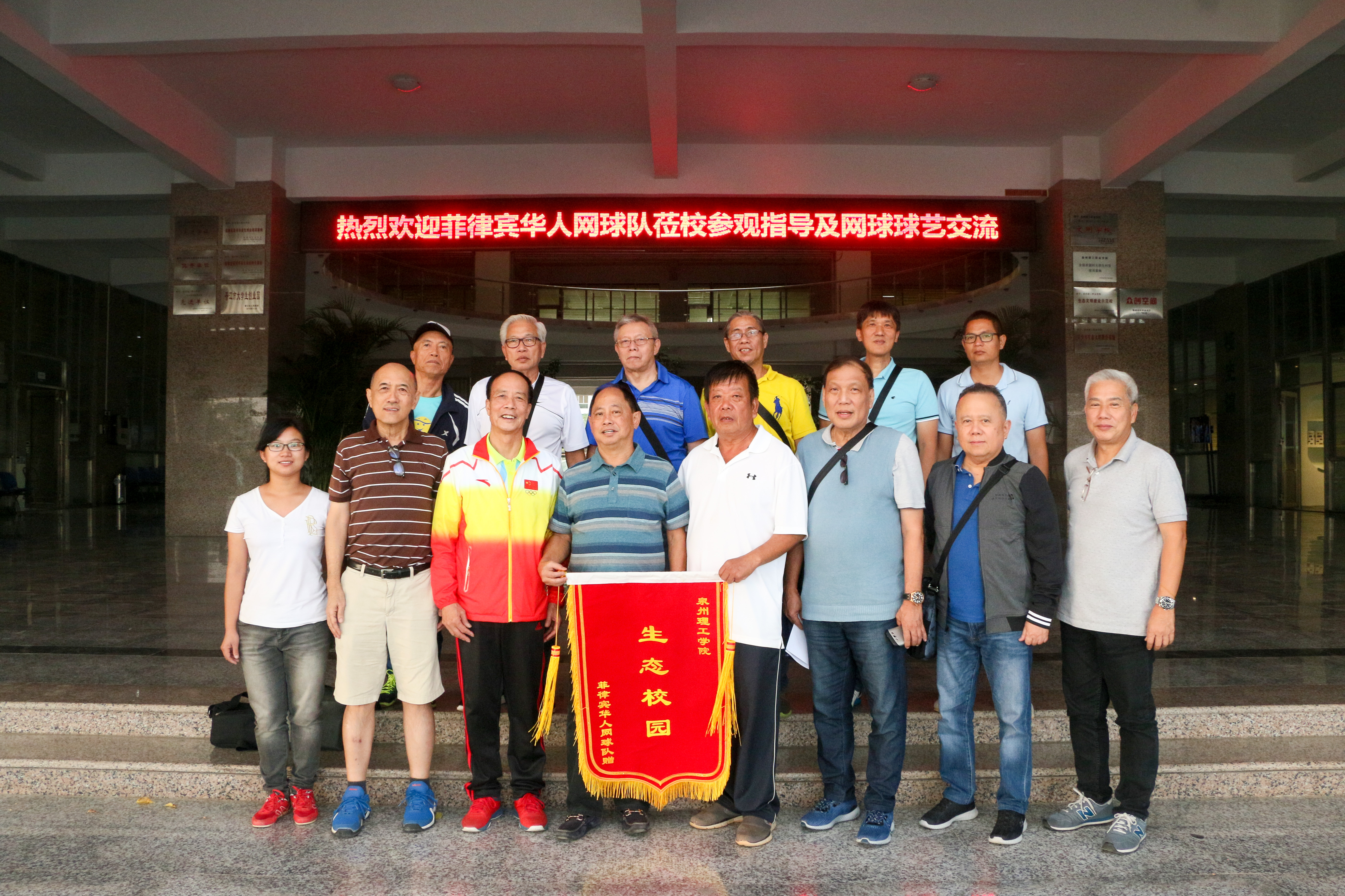 11月16日,菲律宾华人网球队一行12人来校参观交流,校董事长吴金营、党委委员林文艺等相关老师热情接待。大家一起参观了我校校史馆、数字媒体中心等地,了解我校31年的办学历程和成果。在参观过程中,大家对我校生态建设发展表示赞同,纷纷表示校园处处都是绿色,如同一个天然氧吧,并赠送我校“生态校园”旗帜。随后,与我校进行了网球友谊赛。