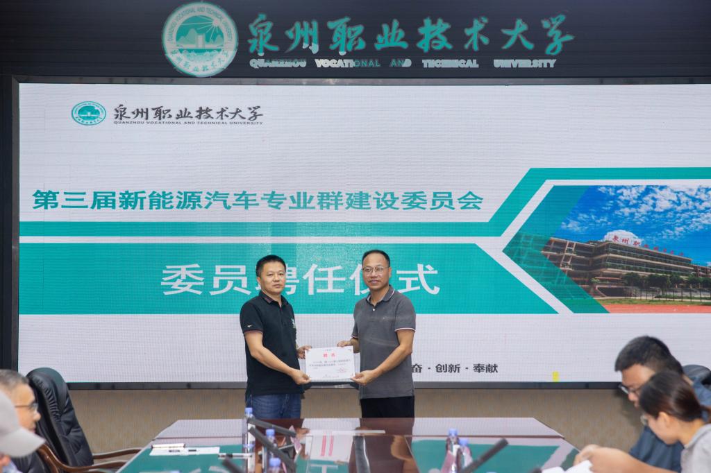随后进行本次会议的第一项议程,为新聘任的新能源汽车专业群建设委员会主任、副主任以及委员颁发聘任书。