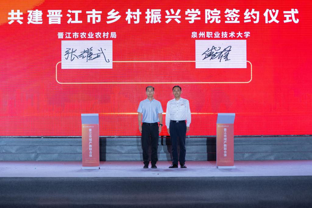 晋江市农业农村局党组成员、二级主任科员张耀武与泉州职业技术大学党委书记傅志雄签约共建“晋江市乡村振兴学院”。