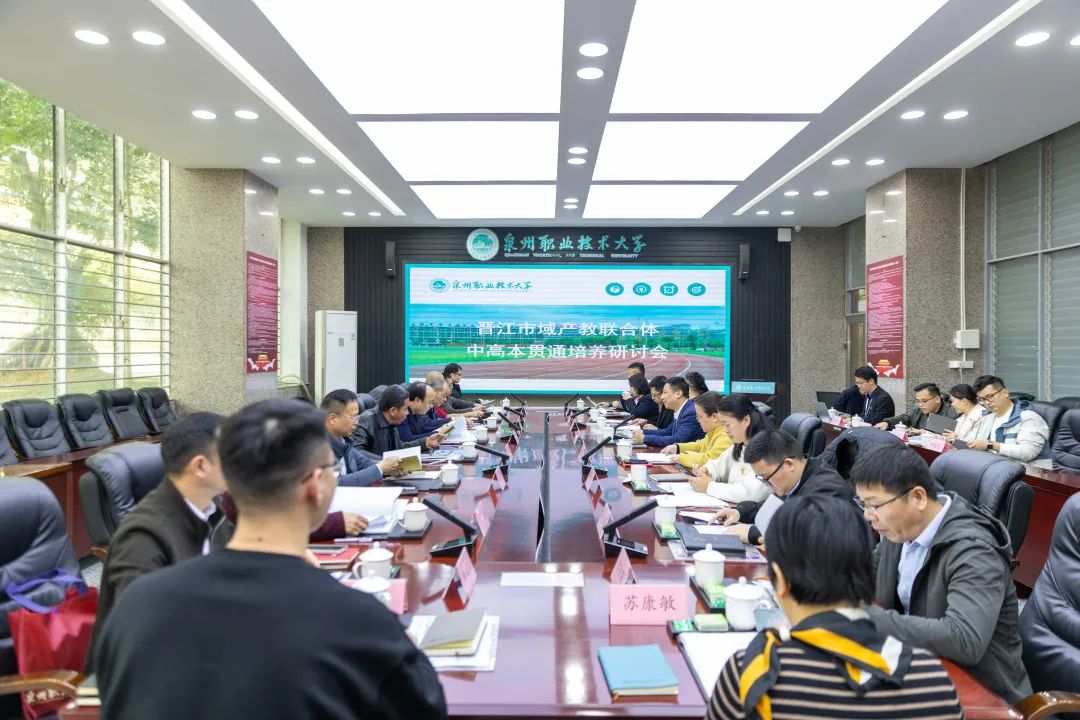 为推进晋江市域产教联合体建设,拓展学生成长成才通道,1月15日,晋江市域产教联合体中高本贯通培养研讨会在泉州职业技术大学举行。晋江市域产教联合体副理事长、泉州市高教发展中心主任黄永东,副理事长、泉州职业技术大学校长吴滨如,秘书长、晋江经济开发区管委会副主任张小鹏,副秘书长、泉州市高教发展中心副主任李冬英,副秘书长、泉州职业技术大学副校长郭霏霏与晋江市域产教联合体理事单位代表,泉州市高教发展中心副主任陈兴、晋江市教育局职教科科长钟健、泉州轻工职业学院黄重成副校长、晋江职业中专学校校长刘晓斌、副校长吴文委,晋江华侨职业学校党委书记、校长李克勤、副校长黄培忠,晋江安海职业学校校长杨硕南、副校长翁天妙,晋江晋兴职业学校校长洪妈愿、党总支委员钟建业以及泉州职业技术大学校领导蔡金佩、张建军、苏康敏,秘书处工作人员参加会议。会议由黄永东主持。