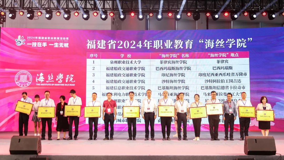 活动上,公布了福建省第一批20个“海丝学院”并进行授牌,为入选首批28个国家级市域产教联合体的晋江市域产教联合体及6个省级市域产教联合体授牌,并表彰在全国职业院校技能大赛中获得一等奖的教师。