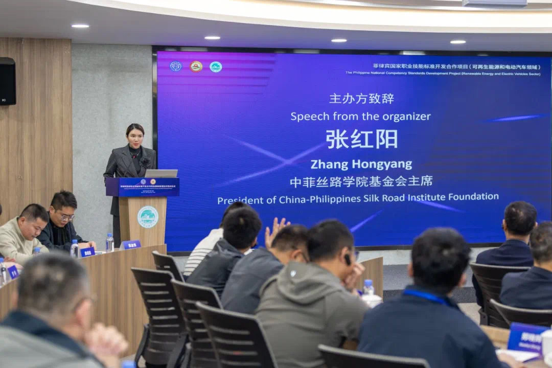 张红阳致辞,她表示,在可再生能源和电动汽车领域的一期项目中,泉州职业技术大学、山东工程职业技术大学、晋江华侨职业中专学校等参建院校齐心协力、攻坚克难,在不同标准开发任务中发挥关键作用,完成多项重要职业技能标准的开发工作。此次活动大家共同见证一期的项目成果,这些是中菲职业教育合作的重要结晶,为菲律宾相关行业技能人才培养提供有力依据。接下来的二期项目挑战与机遇并存,中菲丝路学院基金会将加强与菲律宾TESDA的沟通协作,精准把握菲律宾职业教育需求,并深化与中方院校的合作,充分整合资源,推动标准开发工作向更高水平迈进。