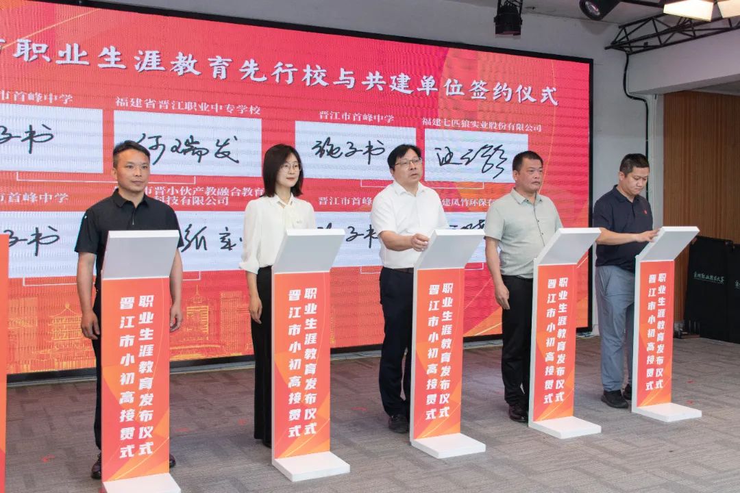 会上举行晋江市职业生涯教育先行校与共建单位的签约仪式。晋江市第二实验小学、晋江市首峰中学、泉州五中桥南校区、福建省晋江华侨职业中专学校等13所先行校与泉州职业技术大学、安踏(中国)有限公司、福建盼盼食品有限公司、福建恒安集团有限公司、福建省晋江华侨职业中专学校、晋江市晋兴职业中专学校等共建单位将携手并进,开展跨界融合,为职业生涯教育注入强劲动能,让教育从“单向输出”转向“共生共创”。