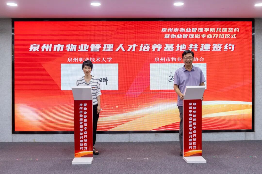 泉州市物业管理协会会长郭志铭、泉州职业技术大学人居环境学院执行院长吴铭辉签署行业人才培养协议。