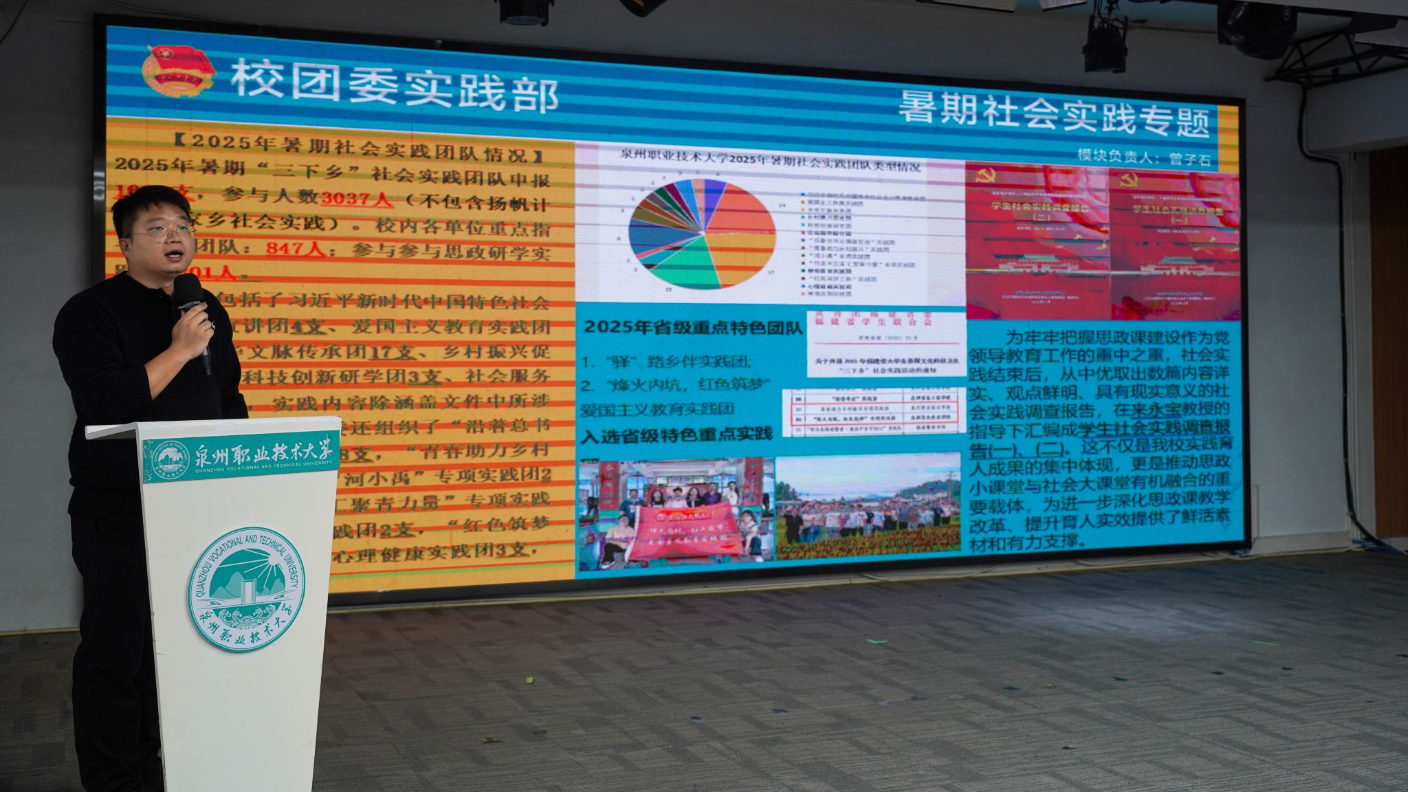 12月4日,泉州职业技术大学2025年暑期“三下乡”社会实践活动总结暨表彰大会在A633报告厅举行。晋江团市委副书记陈弘光,晋江团市委二级主任科员、组织部副部长李婷婷博士,内坑司法所所长苏雅雅,校务顾问、马克思主义学院首席专家来永宝,马克思主义学院院长杜秀娟,学工处处长、校团委书记黄胤聪,以及教务处、学工处、各二级学院负责人、各书院党团书记、实践团队指导老师和学生代表共同出席。