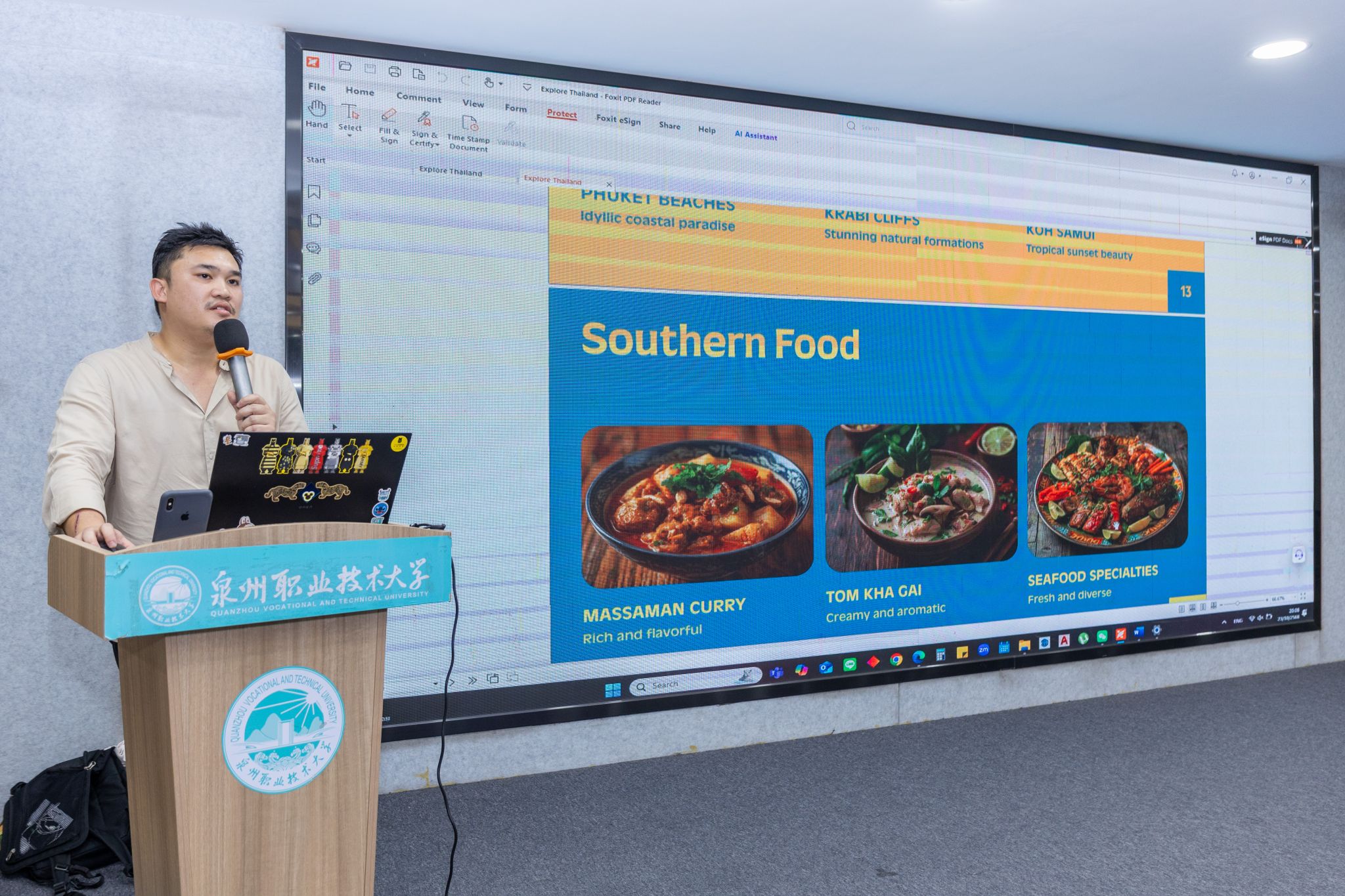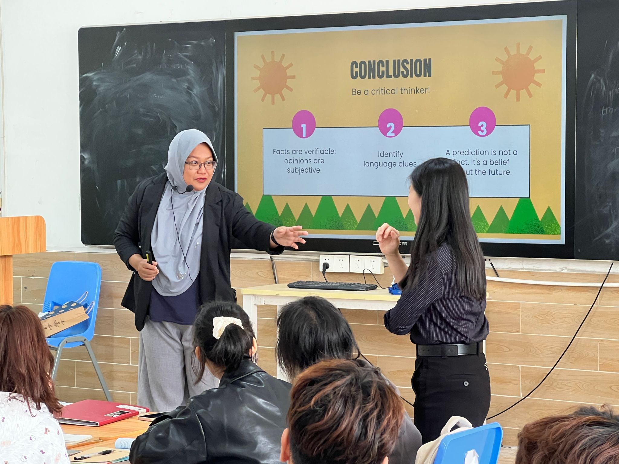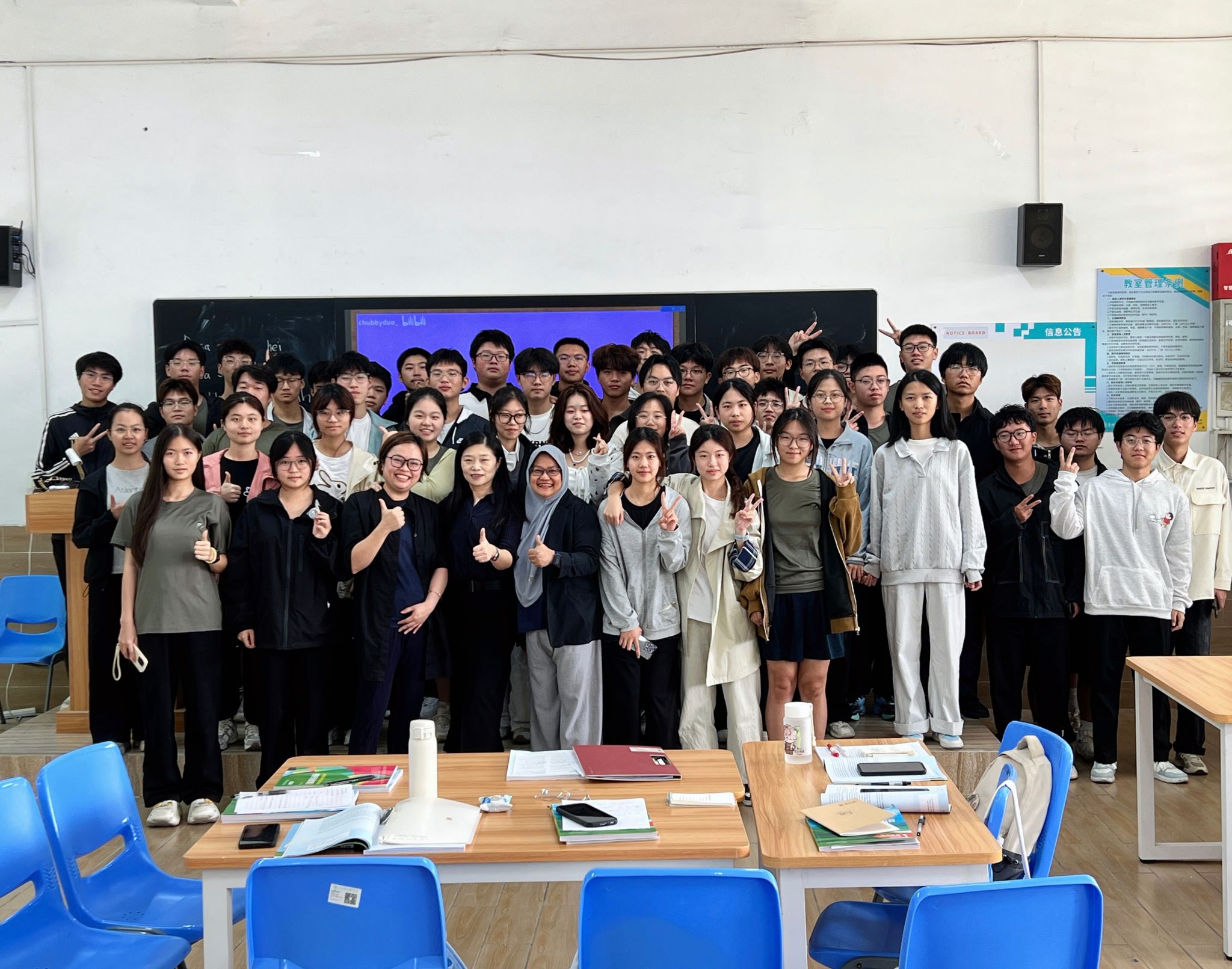 在英语课堂上,马来西亚玛拉工艺大学的教师黎思湄、罗哈思琳·罗斯莉也受到学生欢迎。泉大国际语言中心主任刘颐琳副教授对共创课堂给予高度评价,“外教的讲解清晰易懂,善用生动案例、结合生活场景和肢体语言将抽象概念具体化。”2025级人工智能工程技术1班的陈恩慈则一脸兴奋地说,“外教教我们唱马来西亚歌曲,还给大家带来精美的小礼物,营造出很好的互动氛围,让每位同学都积极举手,热情地参与到课堂中。”