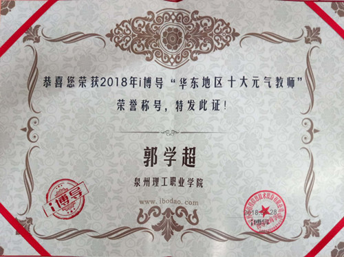 我院郭学超老师用自己的点滴行动,努力推行信息化教改的落实,积极主动参与教改工作,在此次评选活动中,以第一名的成绩获得“省级十大元气教师”称号(华东地区),以第八名的成绩获得“全国十大元气教师”称号。