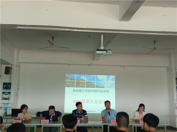 根据2018级新生《大学生活导论》的安排,中营汽车学院在438报告厅举行2018级新生见面会以及专业介绍会,新生见面会有中营汽车学院陈其生院长主持,出席见面会的还有:泉州理工学院副校长庄文瑞、中营汽车学院书记副院长欧阳春风、喻子建教授、王宝霞教授、思政辅导员刘东毅、各班级班主任以及当天早上没课上课任务的老师,以及2018级139位新生们。