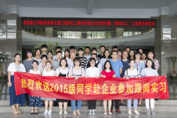7月18日上午9:30,泉州理工学院商学院与晋江致和社工事务所校企合作签约暨“致和订单班”开班仪式在第五会议室隆重举行。福建省民政厅社会工作专业人才队伍建设专家组成员、福建省致和社会组织孵化与创新中心主任夏晋城先生;金门大学社会工作系讲师、厦门市湖里区致和社工服务中心理事长杨蕙祯女士;泉州理工学院校长助理,招生就业处处长、校团委书记蔡金佩老师;商学院院长翁长武教授;商学院副院长陈旭兰高级会计师;商学院党总支书记陈荣惠老师;商学院人力资源管理专业主任张友香副教授;商学院人力资源管理专业专任教师、订单班指导老师沈雪容老师;商学院15级辅导员纪欣婕老师、何丽玲老师以及本次订单班的同学们出席本次会议。